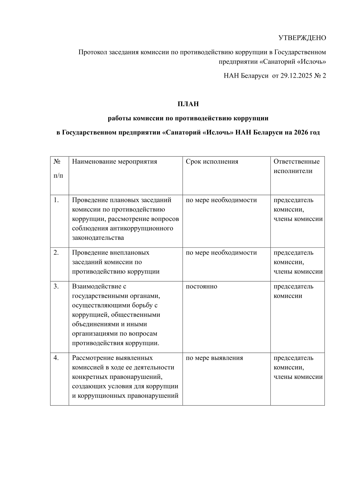 Соблюдение требований законодательства и внутренних правил является приоритетной задачей для ГП "Санаторий "Ислочь" НАН Беларуси. В целях предупреждения неправомерных действий в ГП "Санаторий "Ислочь" НАН Беларуси работает комиссия по противодействию коррупции, направленная на своевременное выявление и предотвращение хищений, коррупции и мошенничества.